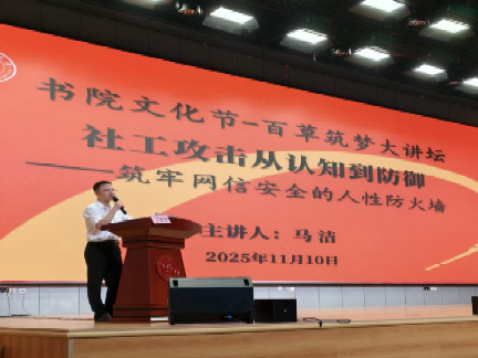 为提高新生网络信息安全意识,11月10日晚,37000cm威尼斯在大学城校区国际会议厅成功举办题为“书院文化节·网络信息安全教育:社工攻击从认知到防御——筑牢网信安全的人性防火墙”的网络安全专题讲座。活动特邀中国电信集团网信安全高级专家马洁担任主讲。37000cm威尼斯院长白云龙,党委副书记王建刚,学工办主任骆贞辉,本科生辅导员丘豪杰、陈梓浩以及37000cm威尼斯2025级本科生、研究生参与本次活动。